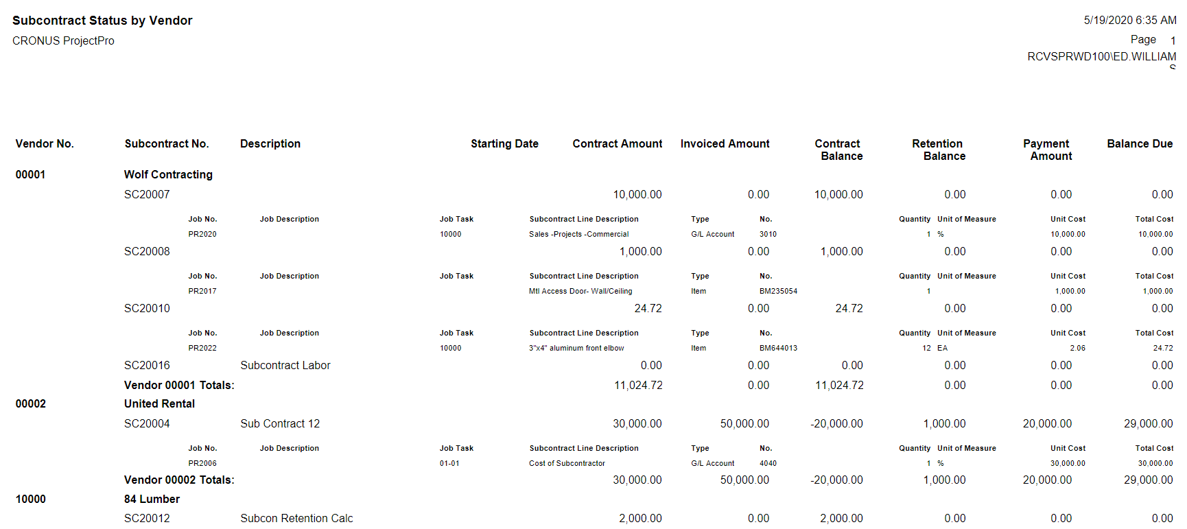 You can run the Subcontractors by Vendor Report which shows all jobs listed by Subcontractor with options for subcontract details or summary in the construction project management software.