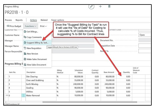 Once the Progress Billing is setup use the “Action” tab and select “Suggest Billing By Tasks”. Enter the “As of Date” for calculating the correct costs relative to your billing period. This if progress billing is for work through 9/30/21, then select as of date through 9/30/21 for costing.