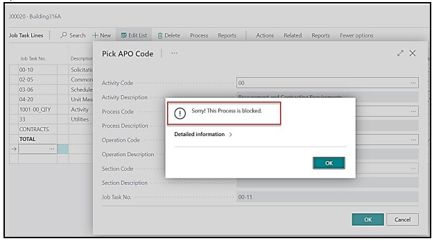The implication is that if the Process code is also blocked, then the system won’t allow to further select the Operations & Sections in the Job Task List.
