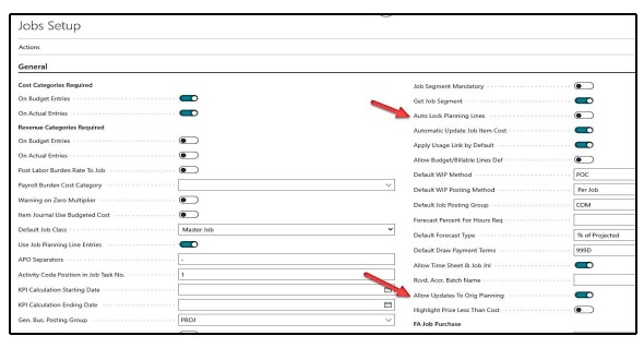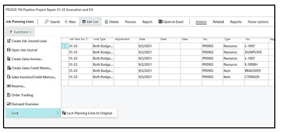 In order to Lock Go to the Job Card and select “Related”, then select “Job”, then “Job Planning Lines” and then select “Action” and “Functions” for “Lock” – “Lock Planning Lines to Original