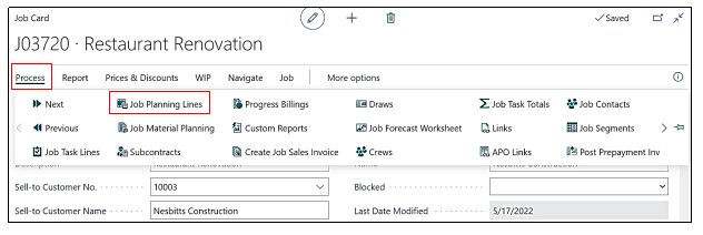 To link a resource to the Item user, need to open the item Card which is needed to add in the Planning Lines of that Job and for that user need to open the Planning lines by following the steps, “Process→Job Planning Lines”.