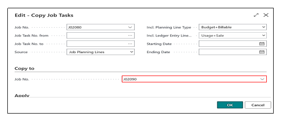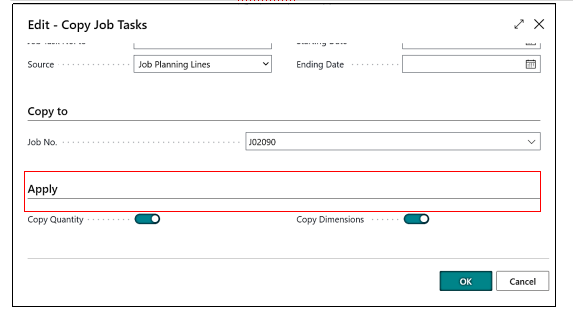 Once the user fills the job Number to which Task Lines need to be copied user must make the Boolean Field as true which are- Copy Quantity & Copy Dimensions, by doing so the task lines which we are copying have some planning Lines with some Quantity of Items, resources, and G/L and by making the Boolean True those Planning Lines with the Quantities will also get copied, the user needs to click on OK