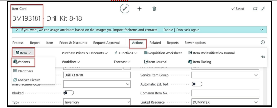 In an item card if a variant is attached. In our example item “Drill Kit 8-18” variant is attached.