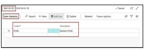 A variant “Variant- 0104” is attached with code “0104” for item “Drill Kit 8-18”
