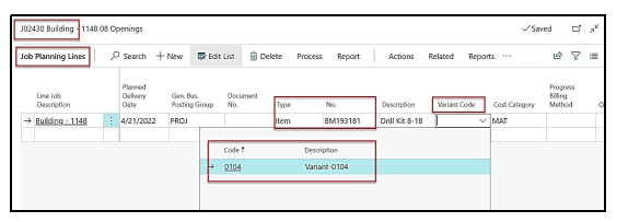 In the Job planning line when we insert the item in the planning line we have the option of attaching the Variant code along with the item.