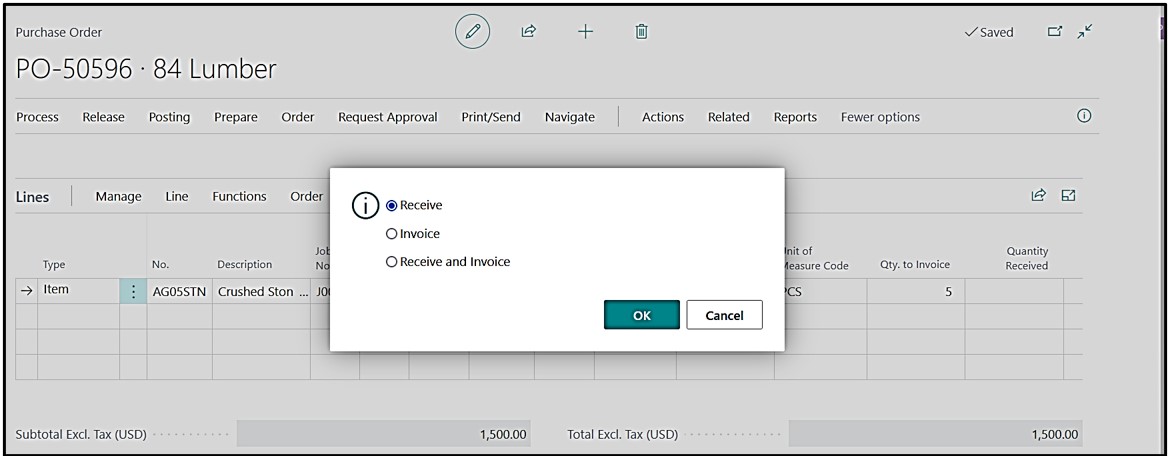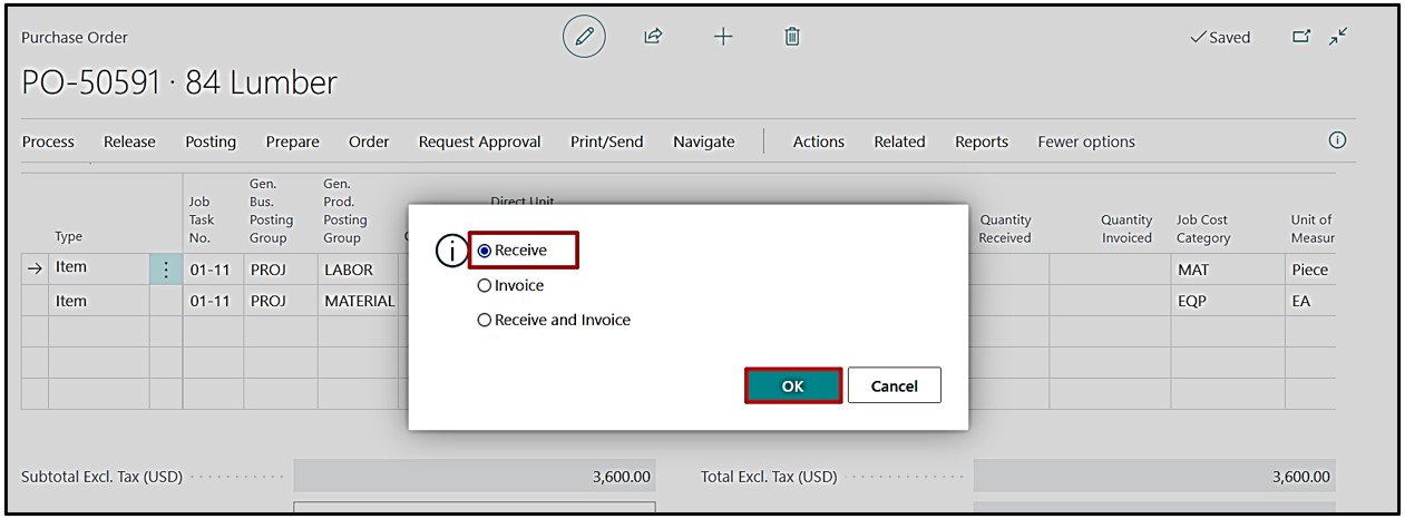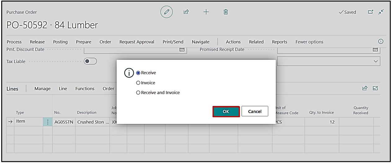 Post Purchase Receive by clicking on Posting→Post→choosing the Receive optionOK.