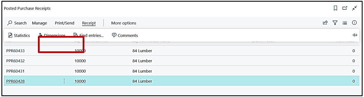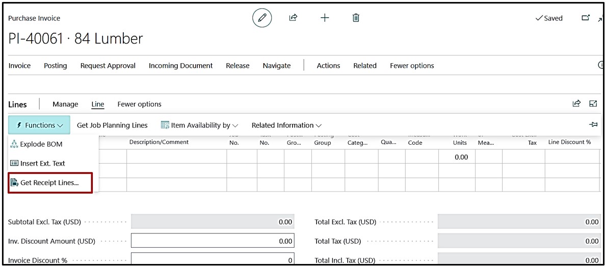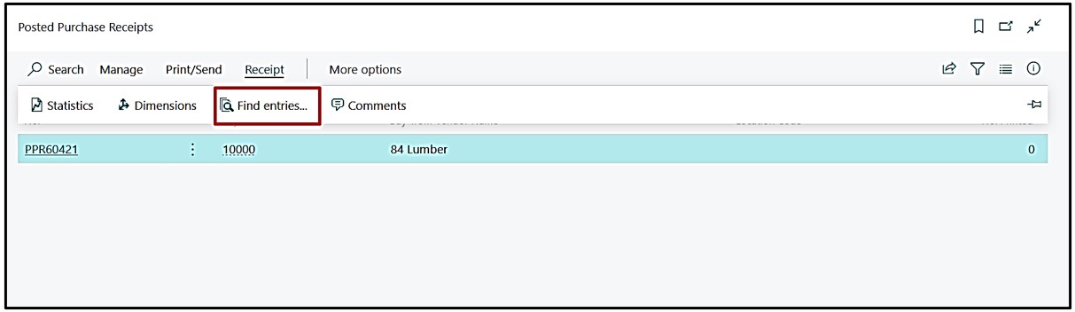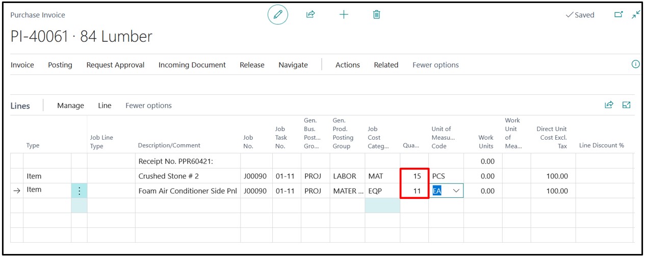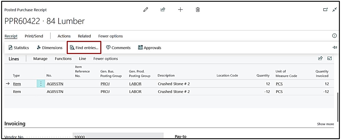 After posting the Invoice we will again check the Job Ledger Entries on the Posted Purchase invoice by selecting the first Posted Purchase receipt line.