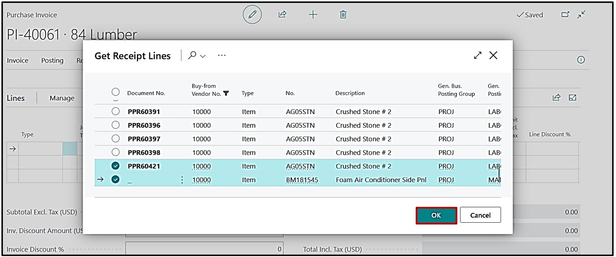 Click on Get receipt Line the receipt lines page will open and select Receipt lines and click ‘Ok’