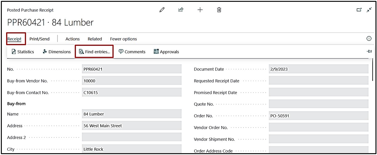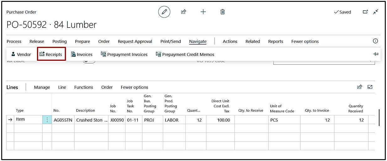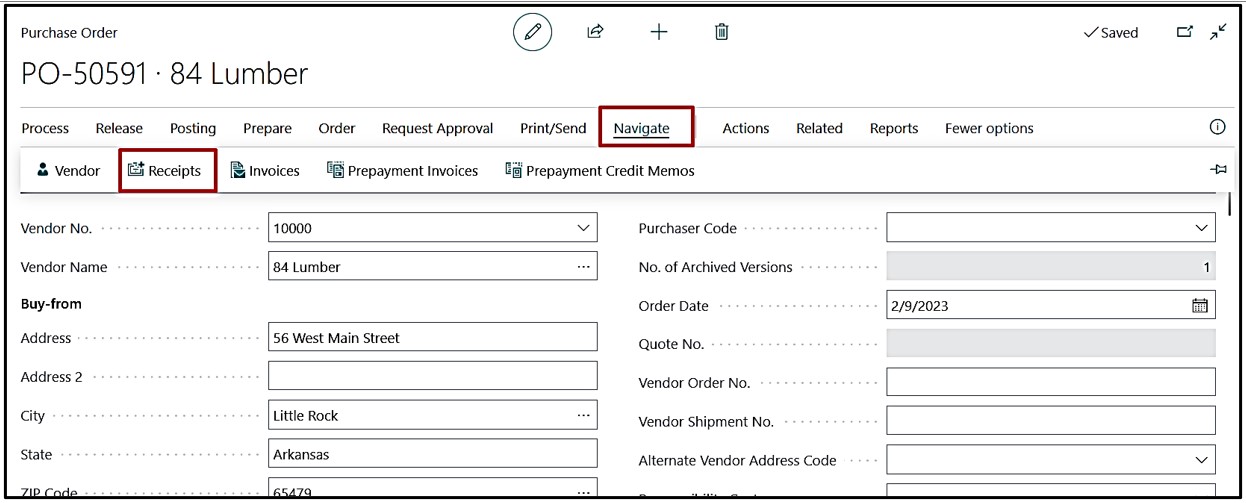 Navigate Posted Receipt from Purchase Order using click navigate→Receipt.