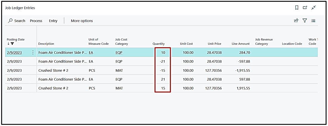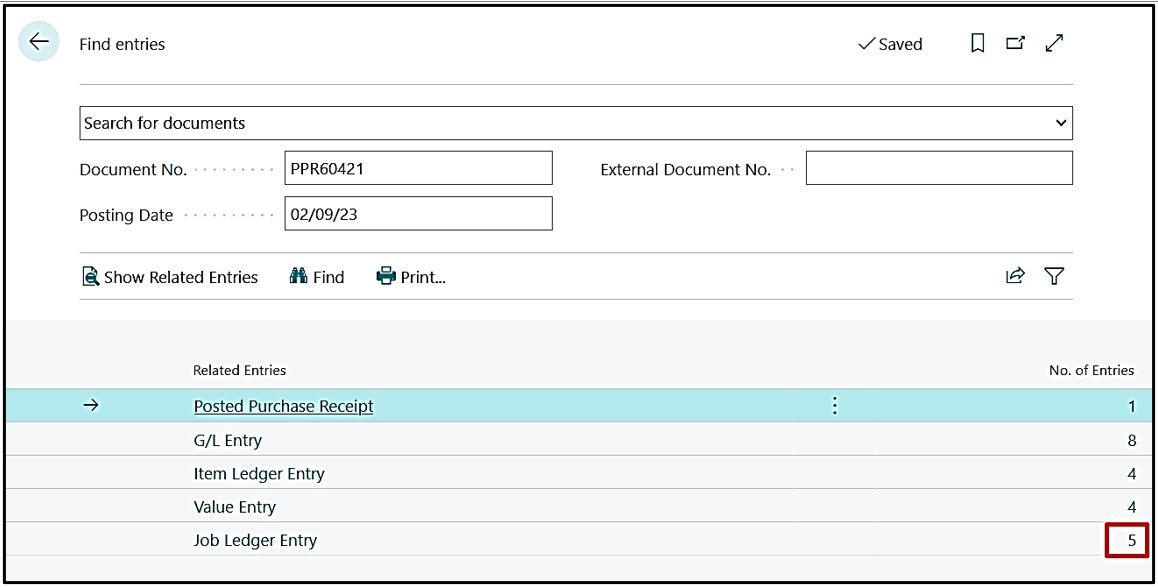 On Find Entry page we now open the Job Ledger Entry and there we can see that the system has knocked off the Actual entry which was 5 and created the Interim Entry which is 2 because we have invoiced 3 Qty. against 5 and system is working here on FIFO basis.