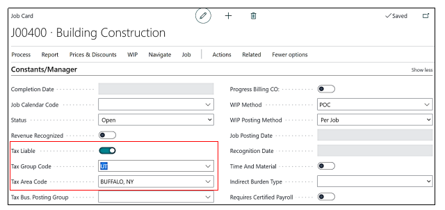On Job card Constants and Manager Tab we will make the Tax Liable Boolean as True, Tax Group Code as Use Tax (UT) and Tax Area Code as BUFFALO, NY.