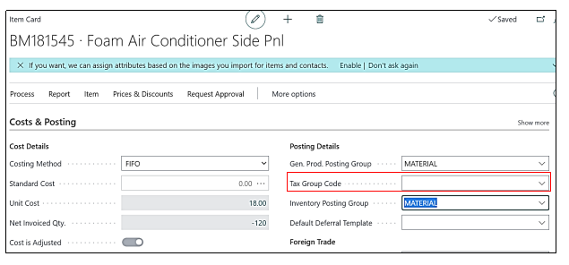 On Item card under Cost & Pricing Tab, we will make the Tax Group Code as use Blank.