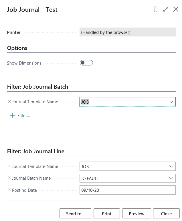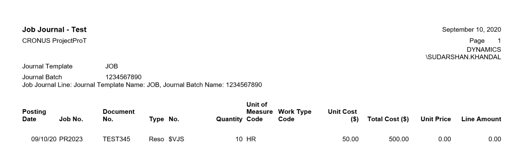 This section describes the Test Report option in Job Journal. Click Actions?Posting?Test Report.