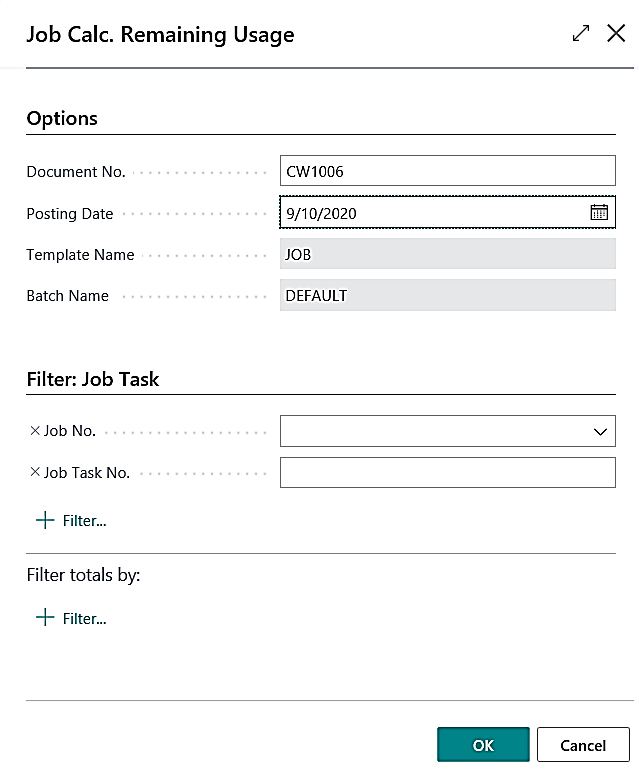 Enter a Document No. and Posting Date for the journal lines. Enter a Job No. filter and if needed Job Task No. filter. Click OK