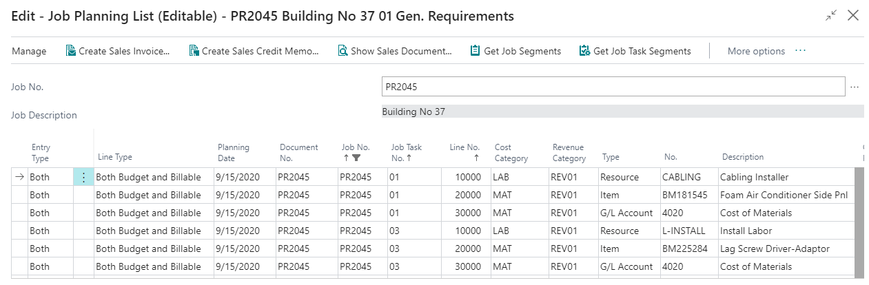 The Job Planning Lines must already exist with entered Revenue Category for them, before you create a progress billing. Note that the “Line Type” transaction must be Billable or Both Budget and Billable to be used by progress billing.