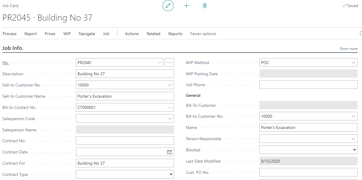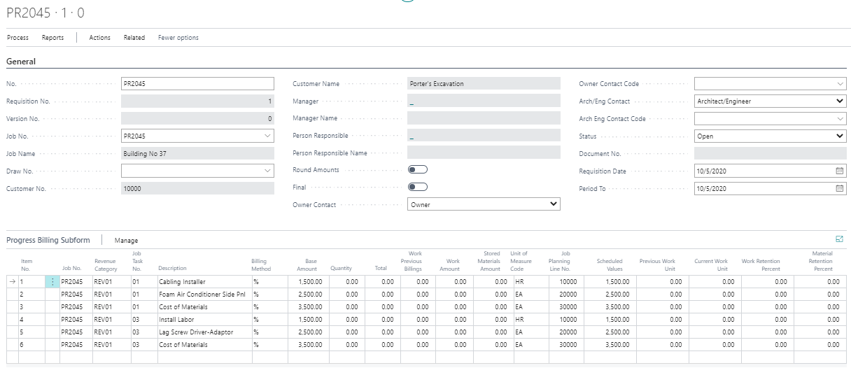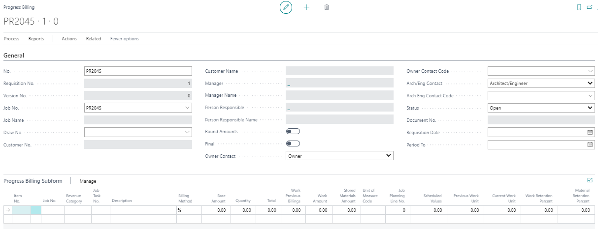Select Progress Billings from the Process tab on job card to create a progress billing. The progress billing header is where you create the new Progress Billing No. that will be used for progress billing requisitions. The progress billing no. is usually the same as the Job (as per job setup).