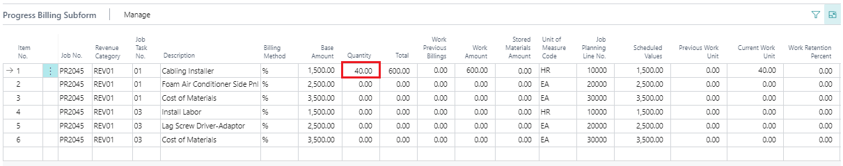 It is necessary to enter the % completion into the quantity field of each line item. In our example, the first revenue item for $1,500.00 contract base amount is 40% complete. This results in a total of $600. See the additional billing line items using either % or units for billing method.