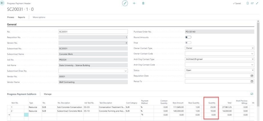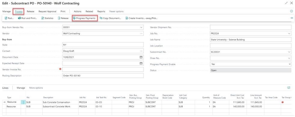 You will notice the lines from your Purchase Order have been added to the Progress Payment.