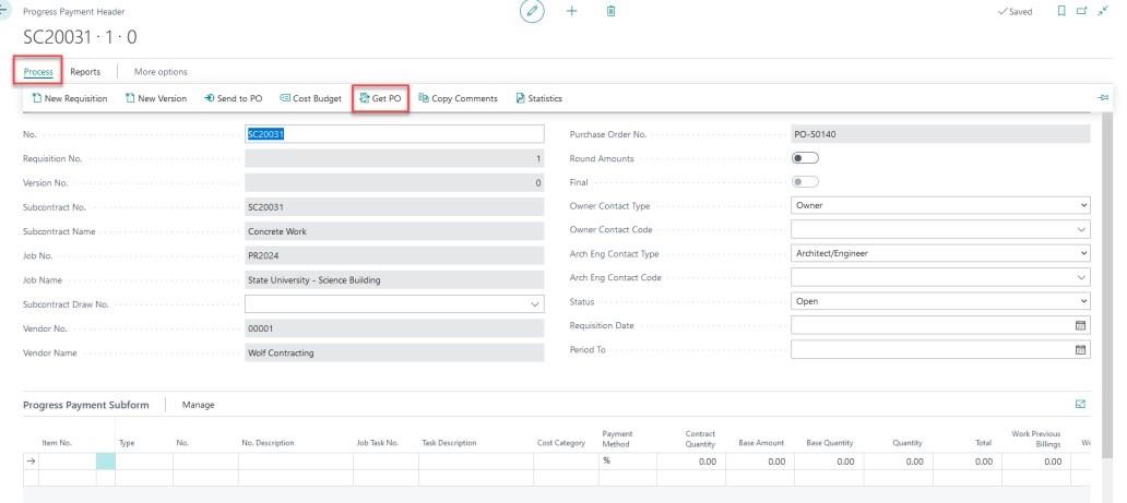 To populate the Progress Payment lines, select “Process” and then “Get PO”
