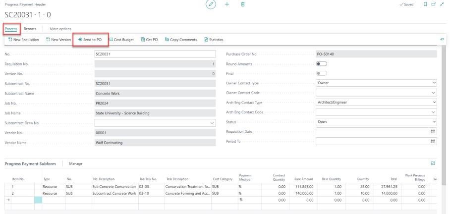 When you have completed your progress payment, return to the ribbon, and select “Process” and then “Send to PO”
