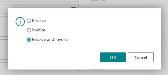 You will be prompted to select whether you would like to “receive” “Invoice” or “Receive and Invoice”. Select the option that aligns with your business processes.