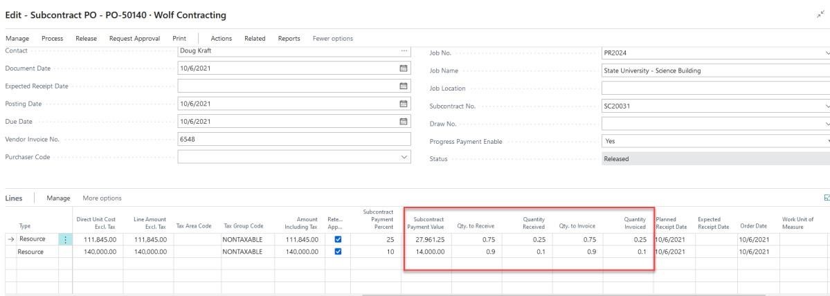 From the Purchase Order Lines, you will see the column “subcontract payment percentage” contains the percentage of each line we paid on our progress payment