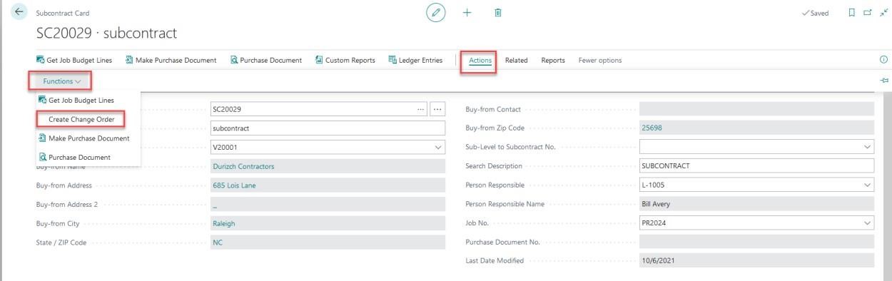 From the Subcontract card ribbon, select “Action” and then Functions. Now select “Create Change Order”