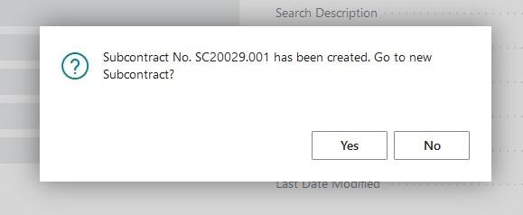 You will be promoted with a confirmation that the subcontract has been created, information about the number assigned, and you are given the option to view the newly created change order card if you wish.