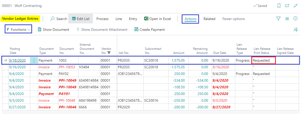 In order to reprint a lien release waiver, you must go to the Vendor Card and select Vendor? Ledger Entries. On the payment entry line change the Lien Release Print Status field to “Requested” instead of “Printed”. Then click Actions? Functions? Print Lien Release.